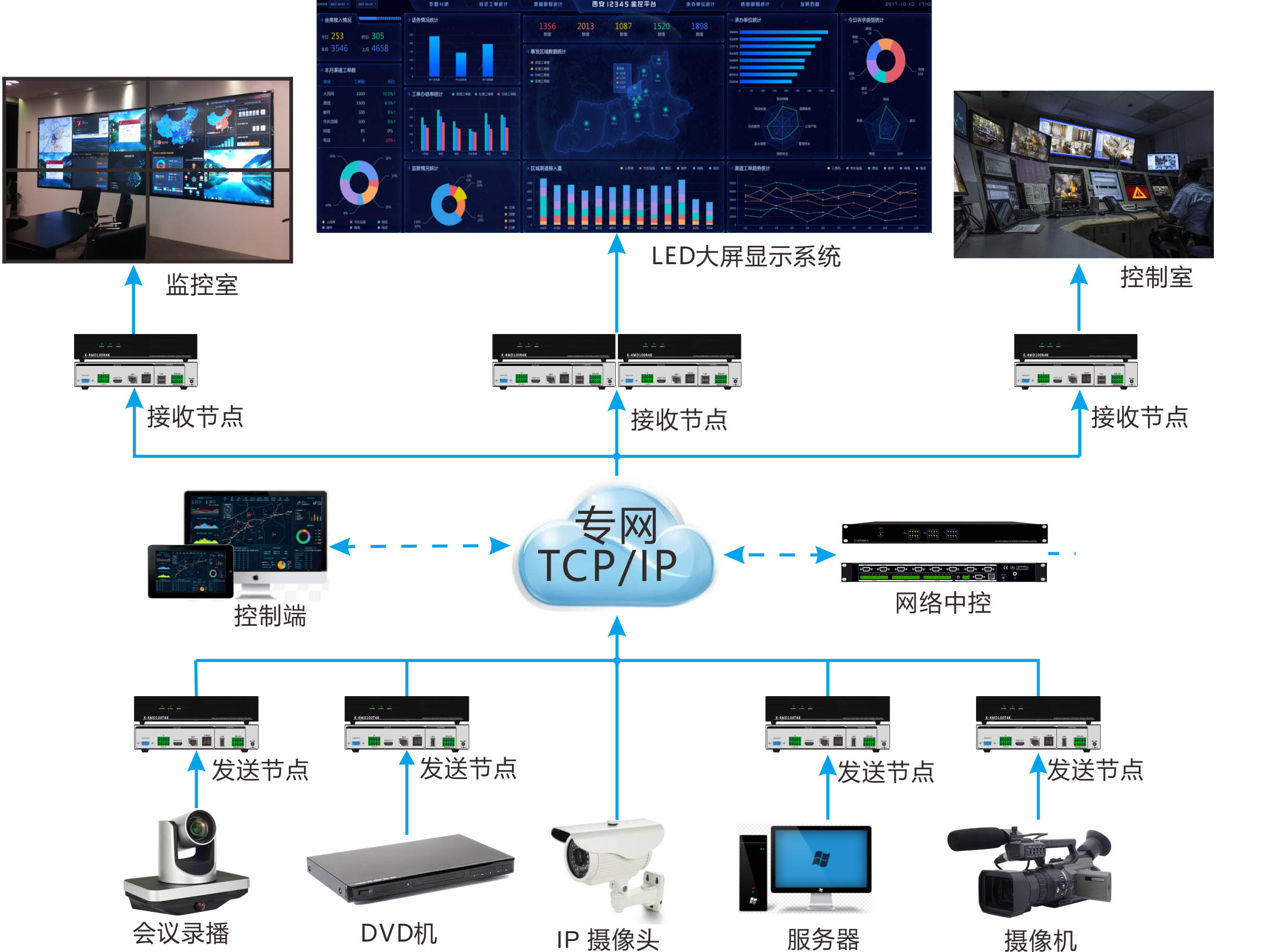 分布式中控系統是通過網絡進行部署,通過管理平臺對 指揮中心 多個會議室進行單獨、統一控制管理 , 通過PC、IPAD等控制終端對會議室設備進行智能化統一管控 。