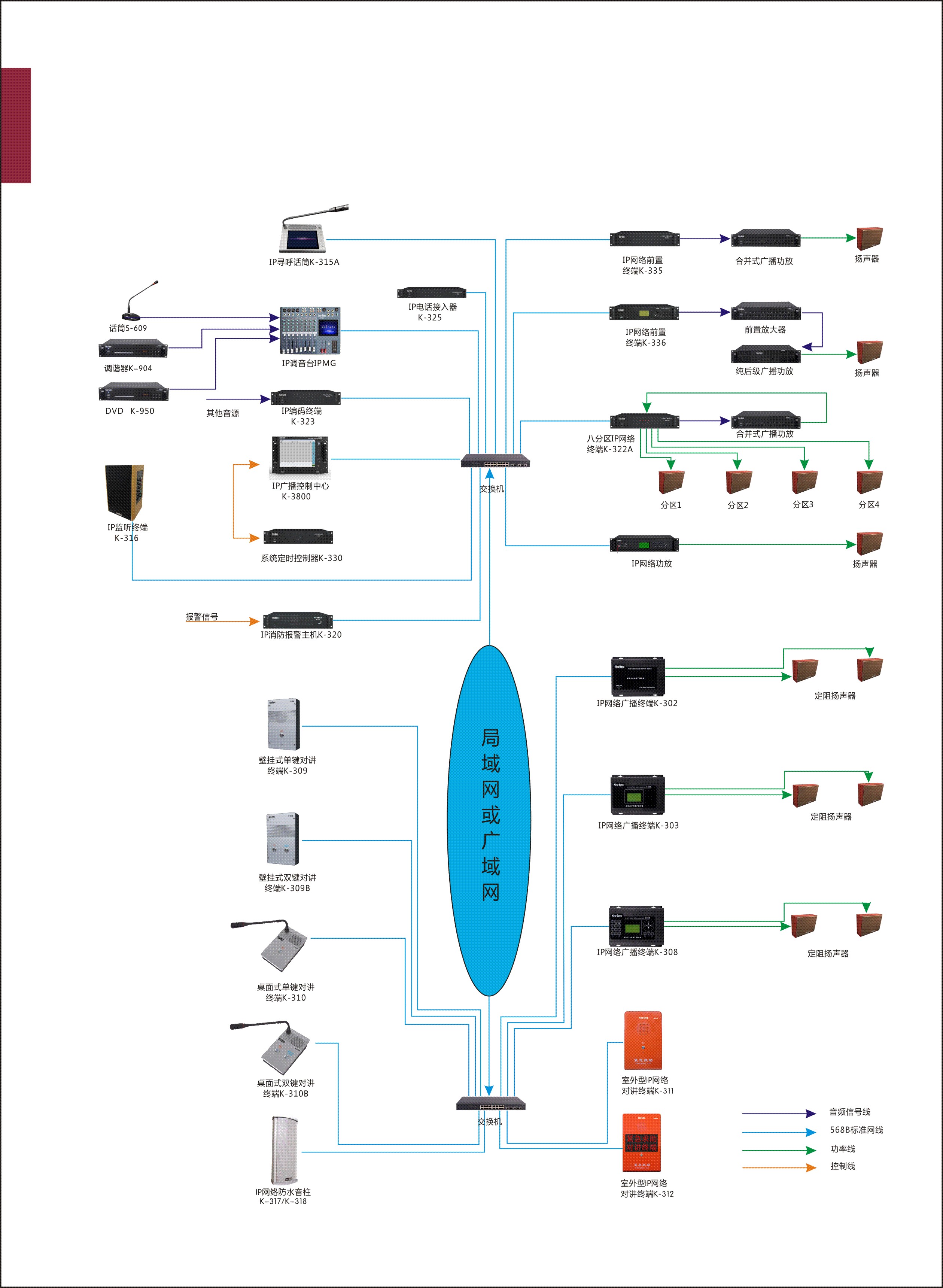 大型綜合性大學往往具備大面積的校園區域或擁有多校區的布局結構,擁有眾多各類型的教學、實驗、辦公、公寓、食堂、體育館及公共服務樓宇等,校園布局合理,環境優美的特點。大學校園公共廣播系統作為服務大學校園日常的各項人性化服務及進行廣播功能而建設,其必需完成滿足大學校園多樣化的功能要求,包括日常的背景音樂播放,各項背景音樂廣播任務分區播放,全天候或定時段播放,無人值守;各項實時業務廣播的播報;消防廣播緊急強插等,要求廣播系統具備高效的穩定性,綜合性,智能化,多樣化等特點。