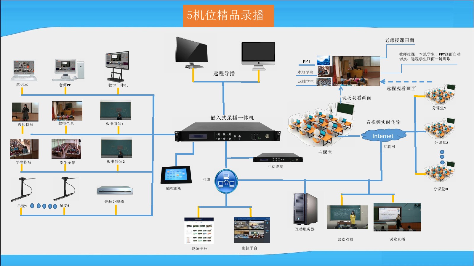 自主研發(fā)的錄播主機,內置互動模塊,一臺錄播機即可完成課程錄制,互動課堂的功能。實現(xiàn)不教室上同上一堂課的教學目的。