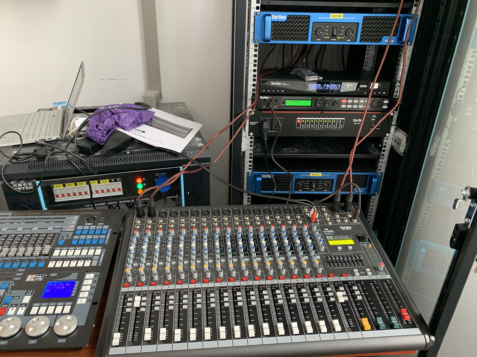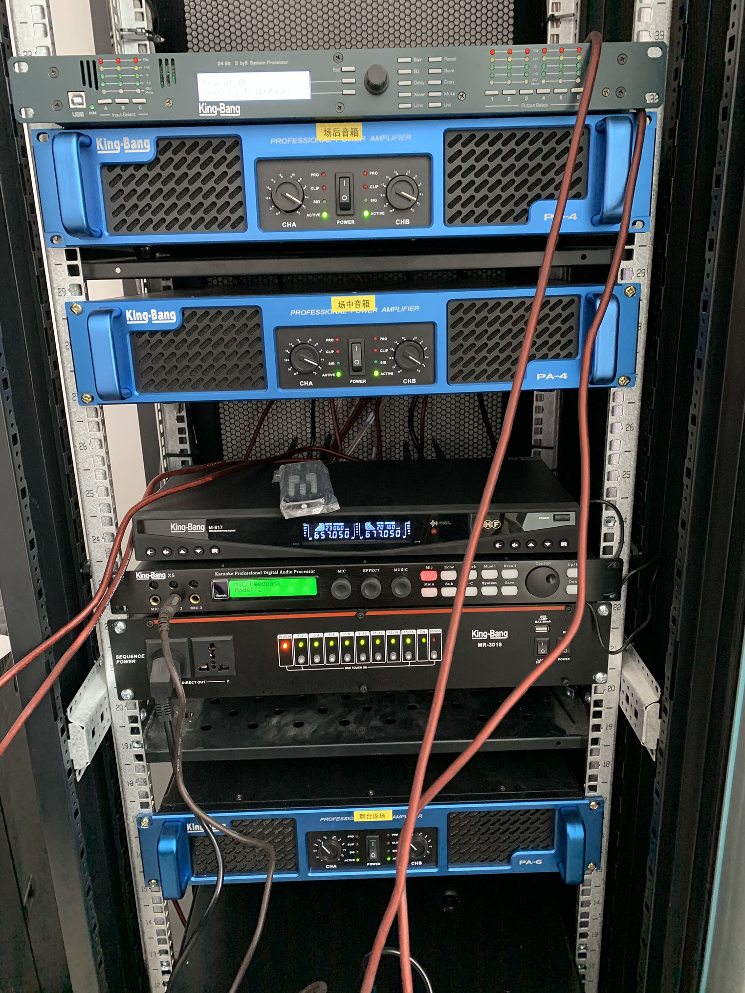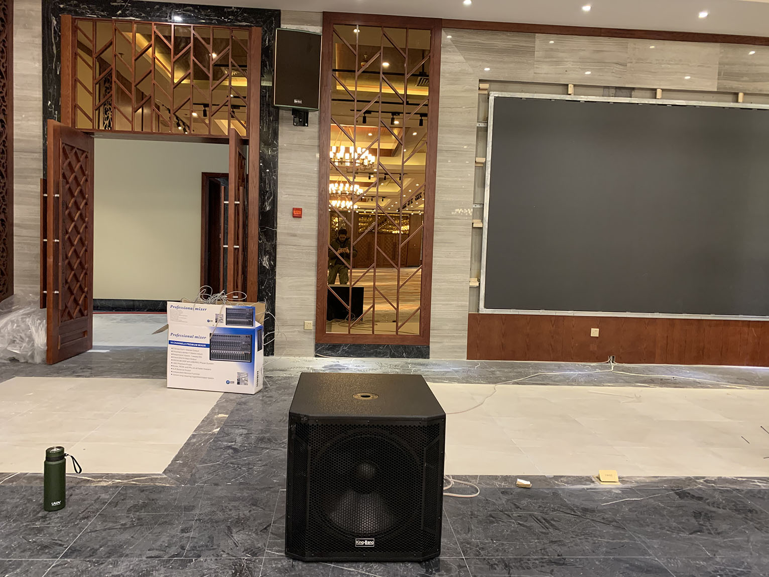 專業擴聲系統中運用了專業功放PA系列,以及周邊設備,宴會廳中的音響采用KB系列以吊掛形式均勻固定安裝在宴會廳內的左右兩側墻體上作現場輔助補聲音箱。該款音箱定向為便攜式/固定安裝打造,音質達到高保真級,高抗壓性,可持續穩定動作。完全能滿足多功能會議廳,宴會廳等專業室內擴聲使用。