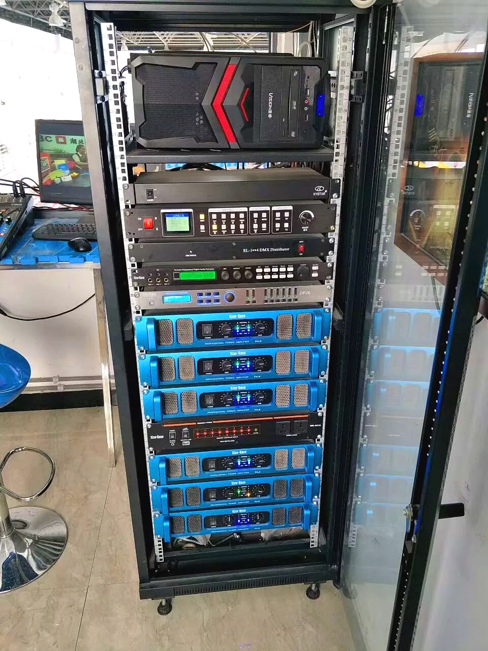 結(jié)合該體育館擴聲場所的實際擴聲需求和功能,設(shè)計應(yīng)用了京邦電子(KING-BANG)的品牌,KB-15兩分頻單15"全頻箱作為主擴聲系統(tǒng),F(xiàn)-18單18"超重低音炮為整場提供良好的低頻沖擊力和量感,同時應(yīng)用了京邦電子(KING-BANG)的全套周邊擴聲系統(tǒng)產(chǎn)品。其聲場覆蓋根據(jù)實際布局進行優(yōu)化,從而實現(xiàn)了聲場均勻、高語音清晰度和大動態(tài)的聲場。
