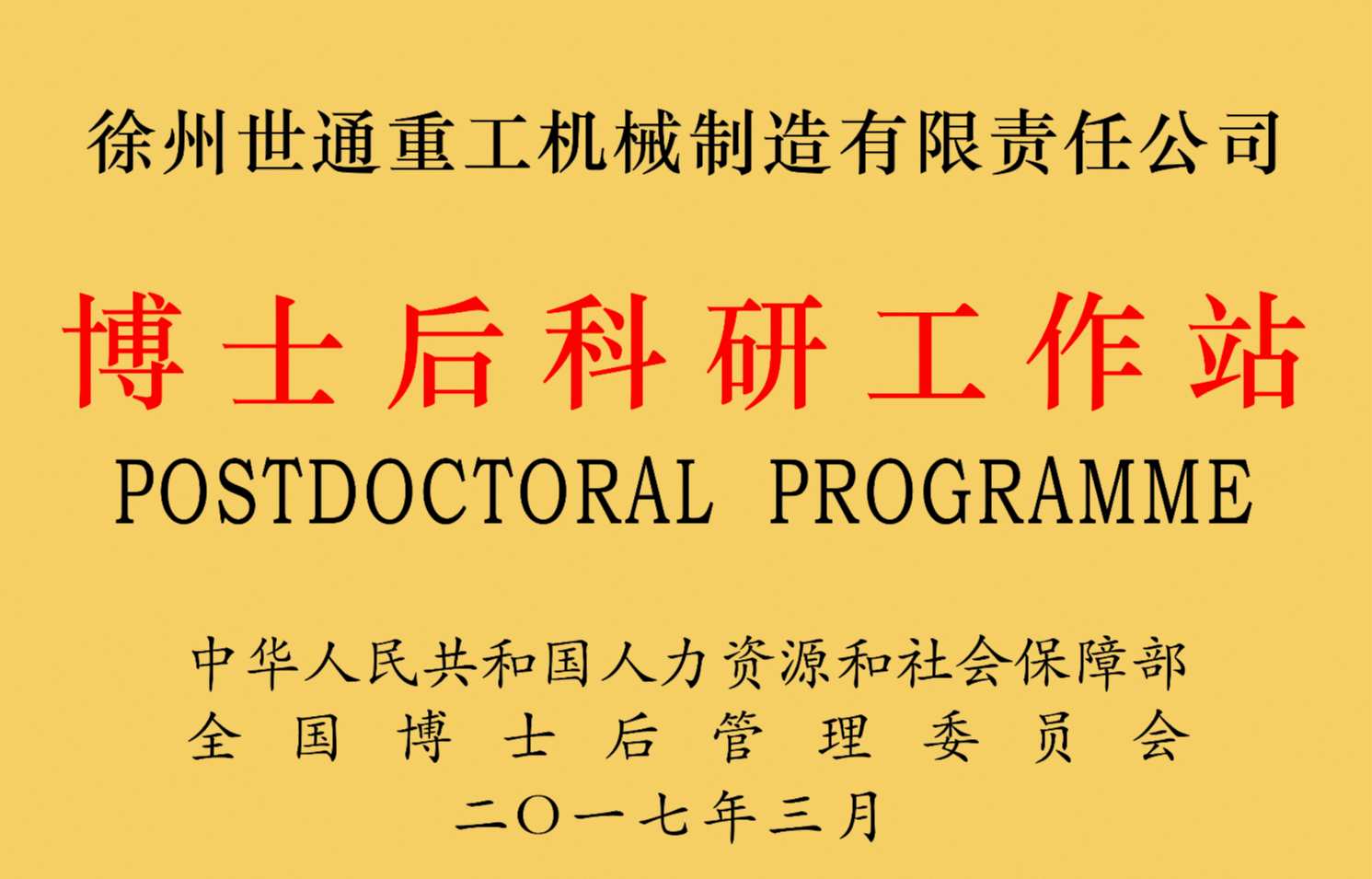 2017年3月,全國博士后管委會(huì)辦公室發(fā)布了關(guān)于批準(zhǔn)增設(shè)博士后科研工作站分站的通知(博管辦〔2017〕24號(hào))。世通重工被批準(zhǔn)在江蘇省徐州市經(jīng)濟(jì)技術(shù)開發(fā)區(qū)設(shè)立博士后科研工作站分站。我司是2016年至今徐州經(jīng)濟(jì)技術(shù)開發(fā)區(qū)唯一獲批的博士后科研工作站。